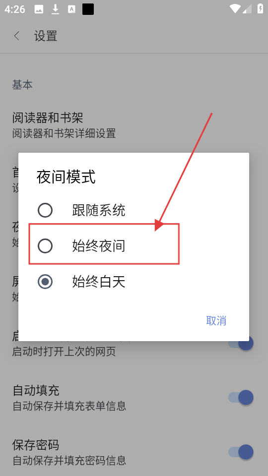 4、在夜间模式选择窗口,若想始终使用夜间模式,点击【始终夜间】,即可设置成功呢。