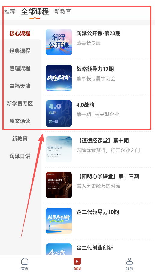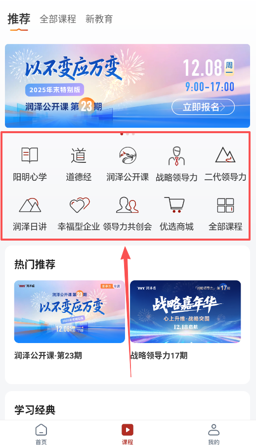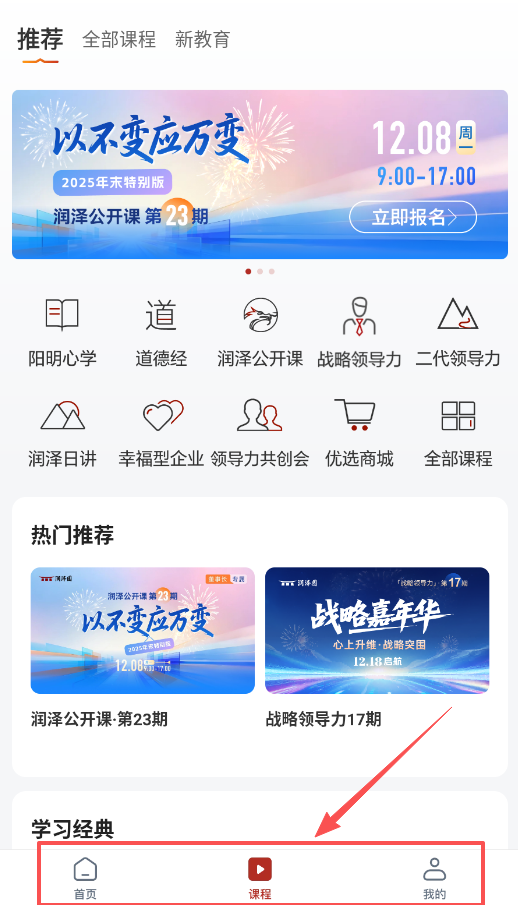 2、在首页上方或课程页面里,可以看到“道”这个导航区,里面分好了阳明心学、道德经、战略领导力等各类课程。