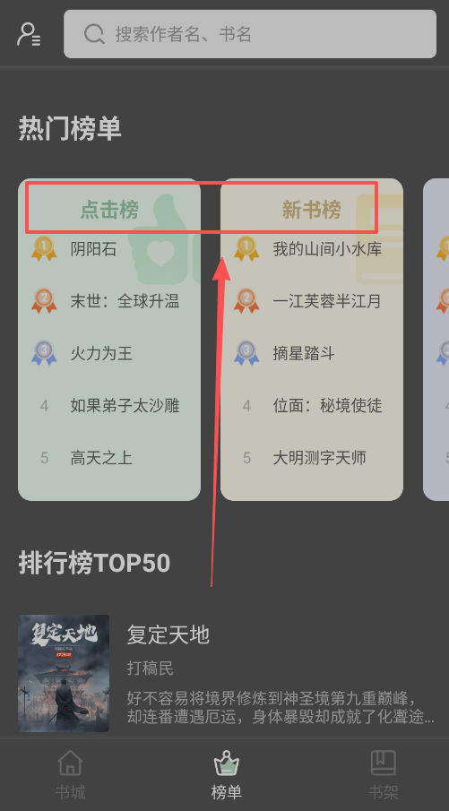3、点击底部导航栏的榜单按钮,可以查看各类书籍排行榜,新书榜则收录较新的作品如我的山间小水库。