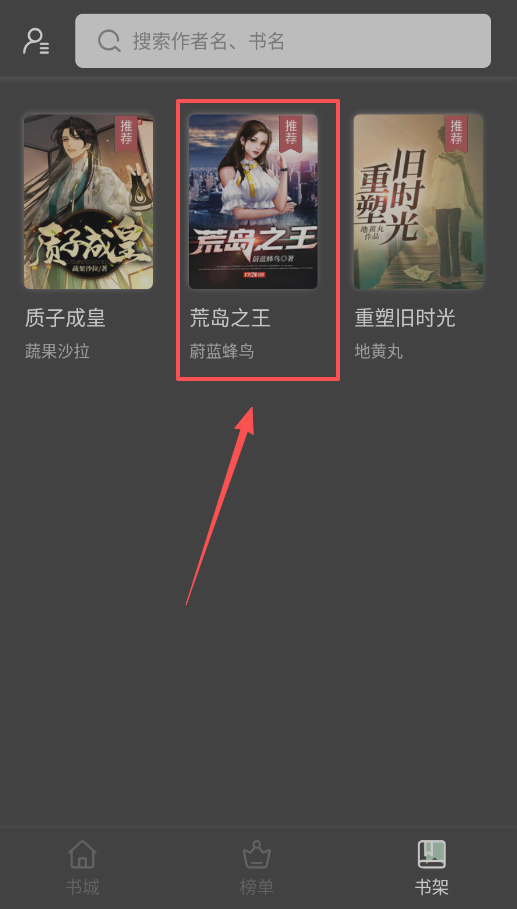2、进入书城页面后,你可以看到质子成皇、荒岛之王等作品的封面展示,点击任意一本即可进入详情页面。