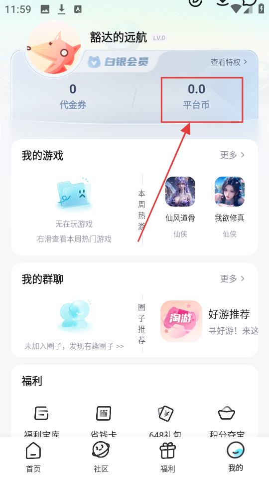 2、在个人中心页面,找到【平台币】选项并点击,进入平台币充值页面,可选择充值数量哦。