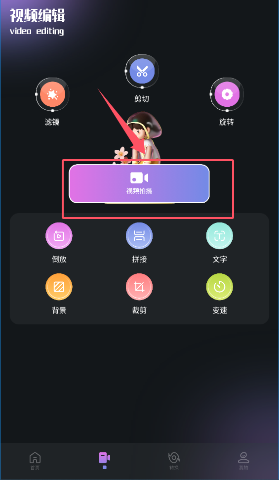 2、想编辑视频?进入“编辑”页面,这里有“剪切”、“旋转”、“滤镜”、“背景”等美化工具,以及“文字”、“变速”、“倒放”等创意功能。