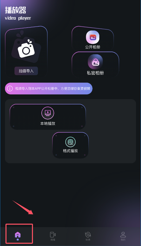 1、首页是视频处理的起点,利用“拍摄导入”添加视频,选择存入“公开相册”或“私密相册”。