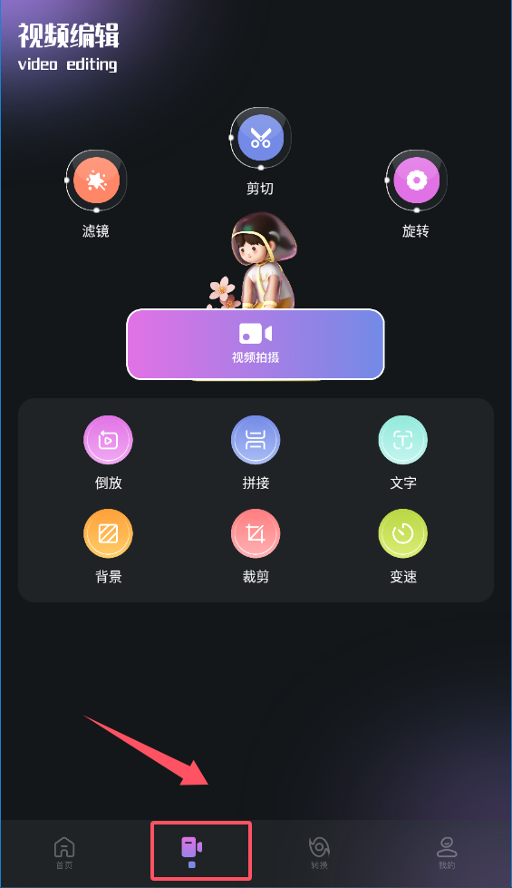 2、“编辑”页面是你的创意空间,提供“剪切”、“旋转”等基础工具,“滤镜”、“背景”等效果功能,还有“倒放”、“文字”等趣味操作,充满乐趣哦。