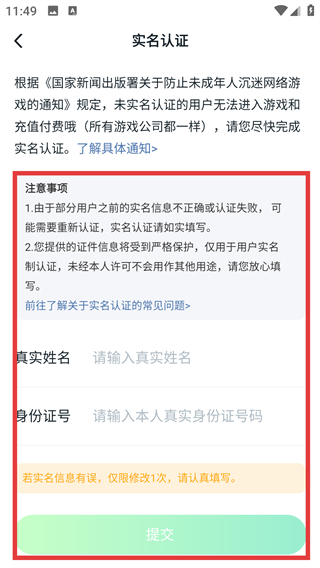 4、进入实名认证页后,按要求填真实姓名和身份证号,确认无误后点提交就能完成认证啦。