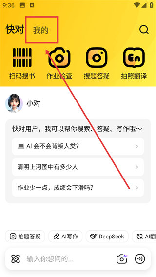 1、首先打开快对作业app,点击页面右下角“我的”图标;在“我的”页面上点击进入“整本上传”