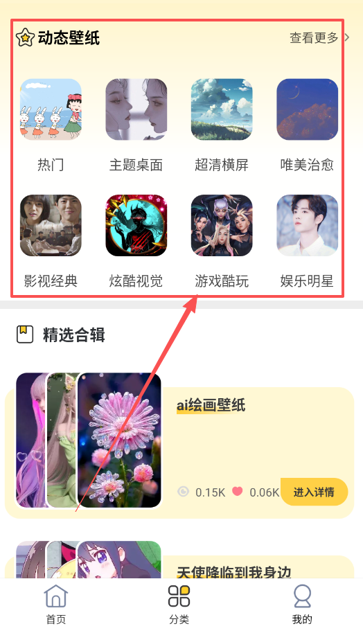 3、寻找海量壁纸资源,进入“动态壁纸”或“分类”页面,在热门、炫酷视觉等分类中浏览,遇到心仪的点击“设置壁纸”就能一键使用。