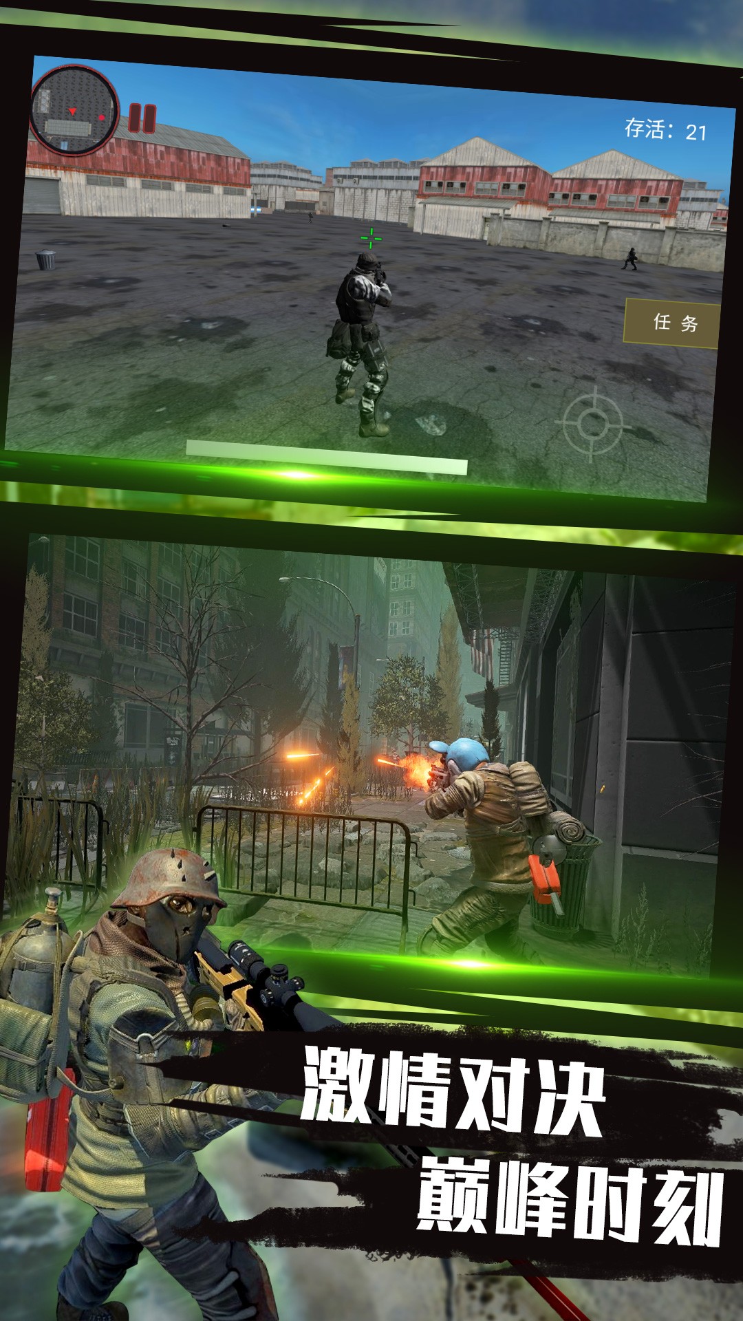 1、勇者射击生存战游戏城市被敌人包围,玩家通过不断的战斗歼灭敌人。