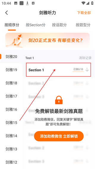 2、进入剑雅听力页后,选目标Test的Section板块,能进入对应听力题的准备页面啦。