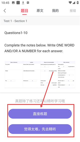 3、在题目准备页,可选【直接练题】或【觉得太难,先去精听】,按需开启听力练习呢。