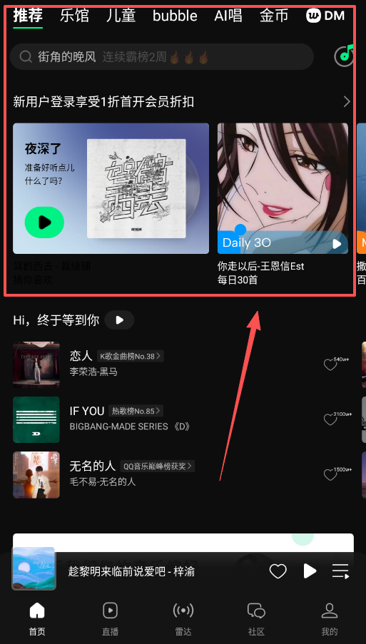 2、发现新歌不必费力搜寻,多利用推荐页的算法推荐,以及乐馆和各类榜单,它们能根据你的喜好智能推送你可能喜欢的音乐。
