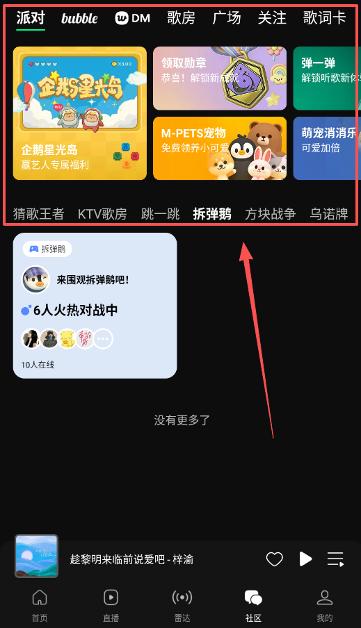 4、休闲时可以切换到直播或派对页面,那里提供了从消消乐到k歌房等多种轻量级游戏,可以作为听歌之余的调剂。