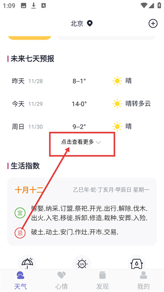 2、在天气页面下方,点击【点击查看更多】按钮,可展开完整的未来天气预报与生活指数等内容啦。