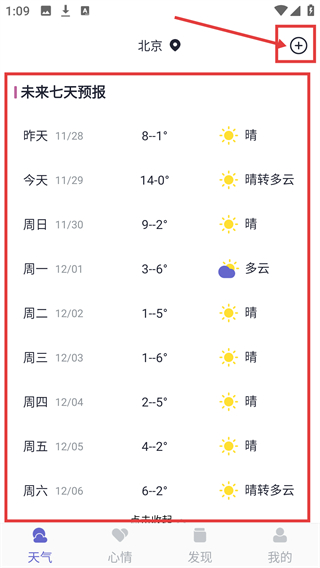 3、展开预报后,点击页面右上角的【+】按钮,可进入城市管理界面,添加或切换其他城市的天气信息呀。