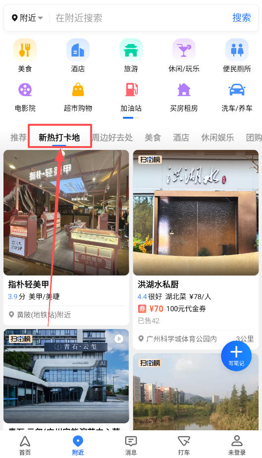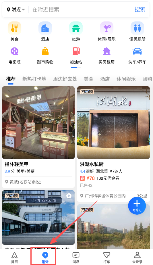 4、多关注附近页的新热打卡地推荐,那里会展示评分很高的特色店铺,包括人均消费和已售券数,发现周边的好吃好玩。