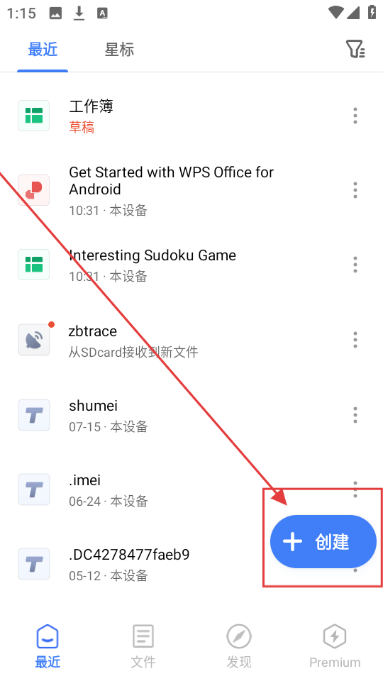 1、在WPSOffice界面,找到右下角蓝色的【+创建】按钮,点击它就能开启创建新文件的操作啦,超方便的呢。