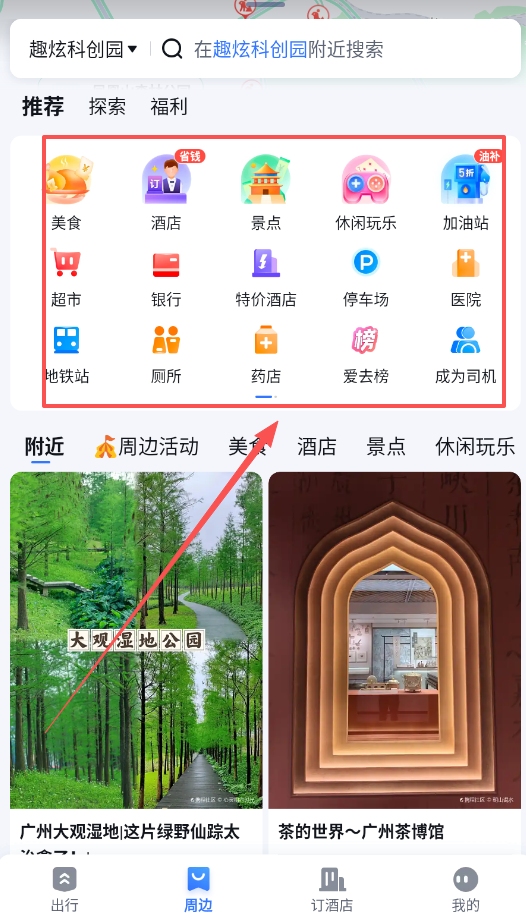 3、探索周边时,进入特定地点页面,利用分类图标快速筛选所需服务,如加油站、停车场或超市,并能直接发起导航。