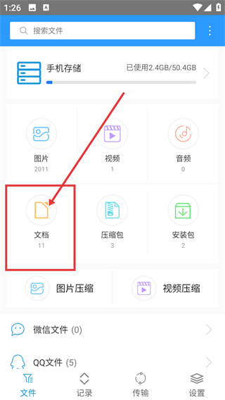 1、在文件页点击【文档】分类,就能进入文档列表页面,查看手机里存储的各类文档文件啦。