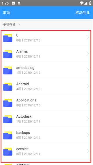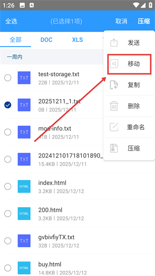 3、选中目标文件后点击右上角菜单,选择【移动】选项,就能进入文件移动的路径选择界面哦。