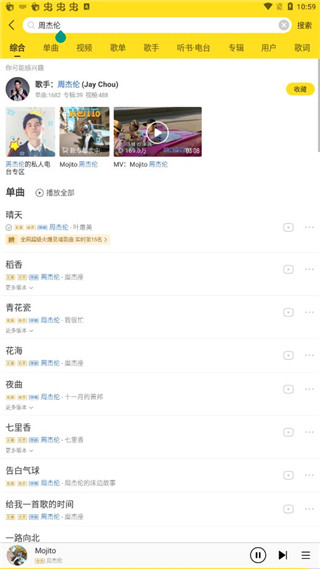 2、在搜索框里输入你想要的歌手名字或者歌曲名称,比如周杰伦或者林俊杰,就能找到他们的全部作品,还可以筛选不同音质版本进行播放呢。