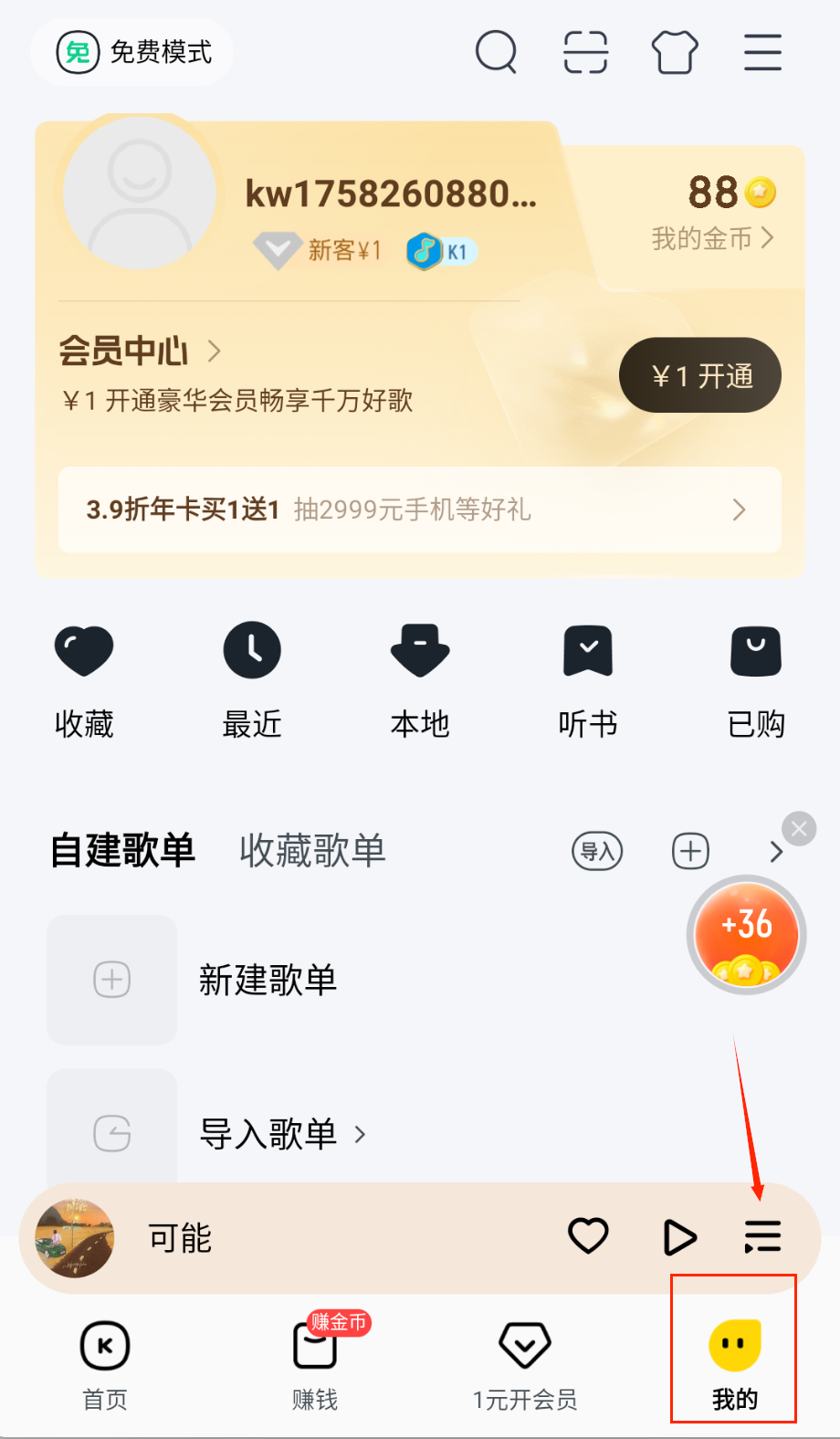 4、个人中心里可以查看自己的听歌记录和收藏的歌单,还能参加各种活动赚取金币兑换会员,记得经常来看看有什么新活动哦。