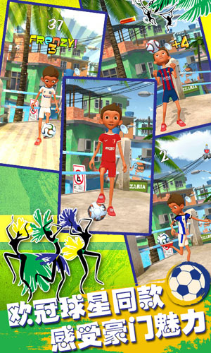 这是一款以“足球王国”巴西为游戏场景的虐心之作!游戏聚集了各大洲豪门球队过百件球衣,和大量可解锁收集的经典足球款型。同时玩家还可学习几十种酷炫花式颠球技巧,比如:环绕地球、脖后停球、连环踢等等… …