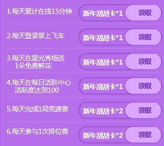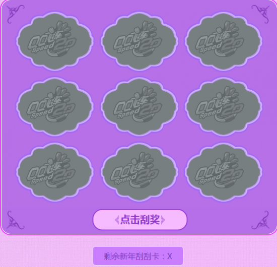 活动期间,每天完成任务可获得新年刮刮卡。每次刮奖将出现9个图案,其中3个相同图案所示的奖励为玩家当次所获得的奖励。每次刮奖将消耗1张新年刮刮卡。