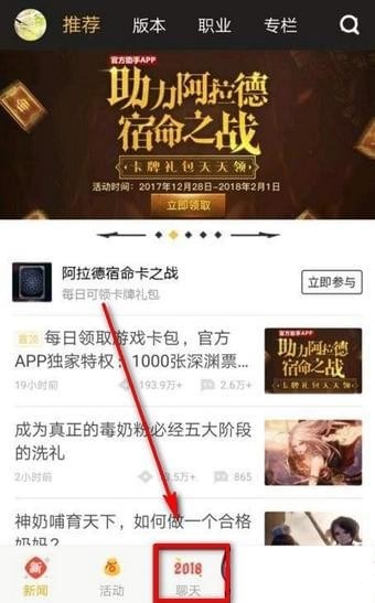1.首先点开DNF助手APP,打开首页,在首页的底部找到2018聊天这个按钮