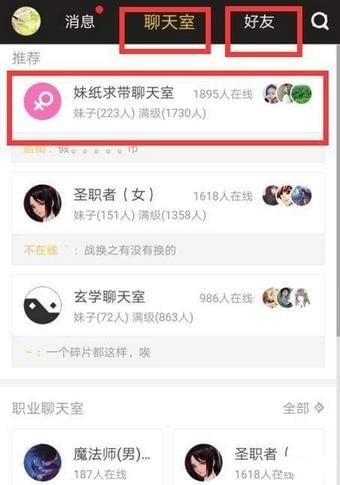 2.进入主界面后,在聊天界面上找到好友,聊天室,和玩家自建聊天室三个位置。