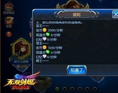 在《无双剑姬》这款手机游戏里面英雄王座里面的等级是分为国王,领主,骑士和勇士这四个阶级的。对应的等级越高级,那么这个阶级的位置也就越少,然而相应的可以获得到的资源也就越多。例如说唯一位置的国王可以获得到,每分钟两千金币和八白钻和五英雄点的高效产出。而相应的领主,骑士和勇士也是会有金币白钻和英雄点的获得,但是可以获得到的量就远远少于国王了。在英雄王座这个玩法里面,只要游戏玩家上位成功了之后就可以免费的获得到这些奖励I。当游戏玩家的等级达到了三十二级之后在每日的八点到二十四点,无论王座空闲或者被占领时,游戏玩家都是可以去挑战的,当游戏玩家挑战的战力超过了当前拥有王座的游戏玩家,那么就可以夺得该王座。而失去王座的游戏玩家只能通过再次挑战才可以夺回王座的位置。