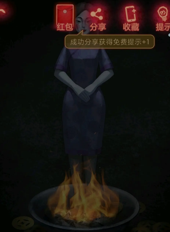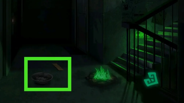 11、拿到空符咒,把门神放在盆内点燃,触发烟雾报警器,熄灭火焰。