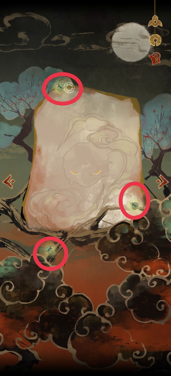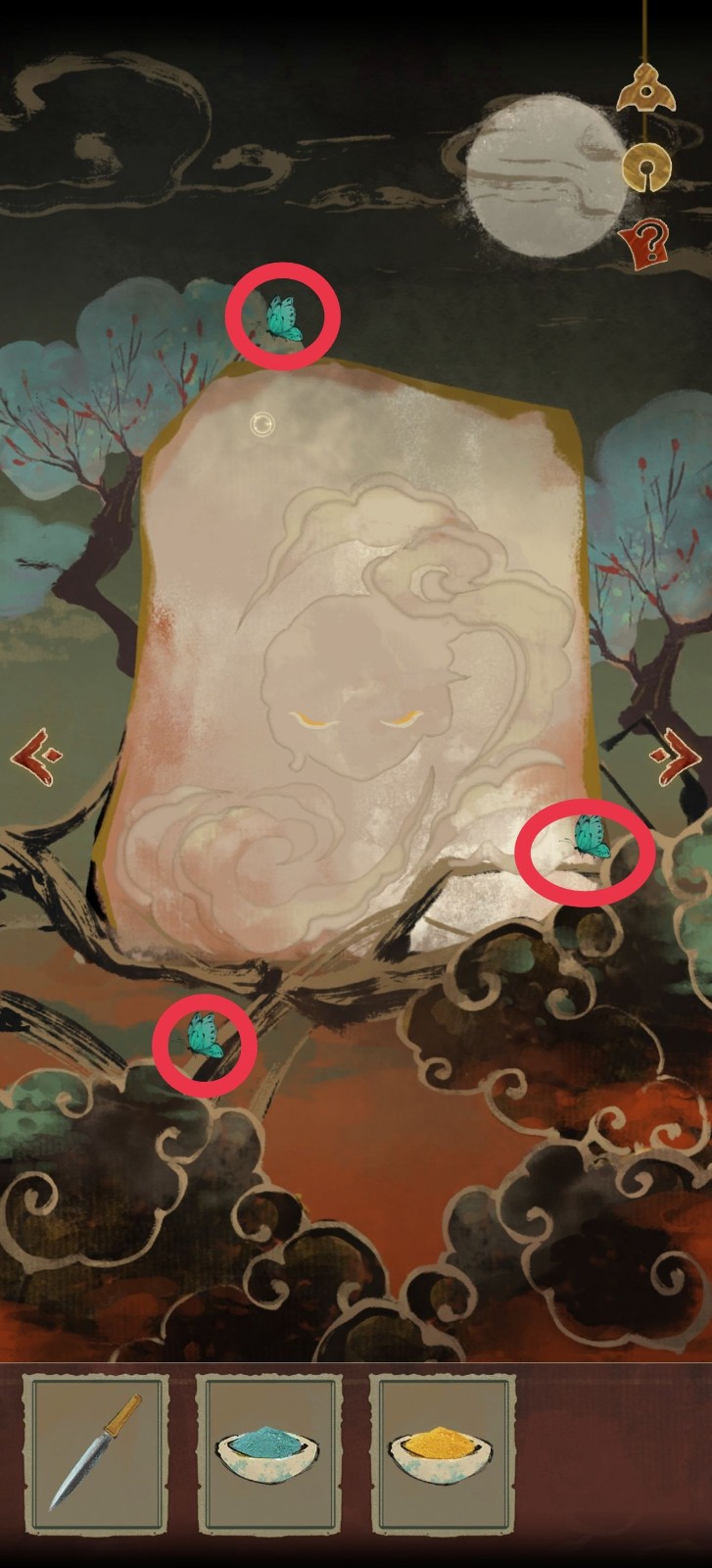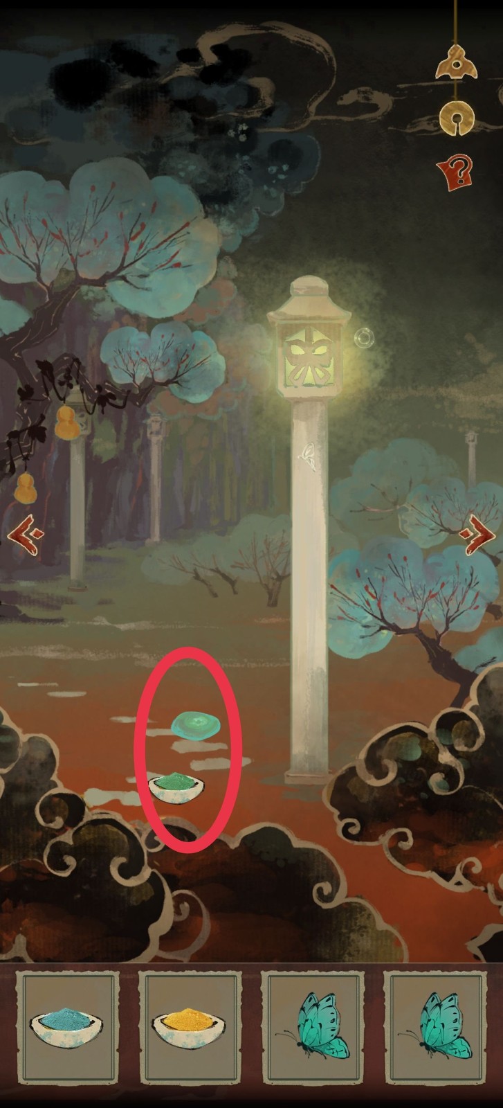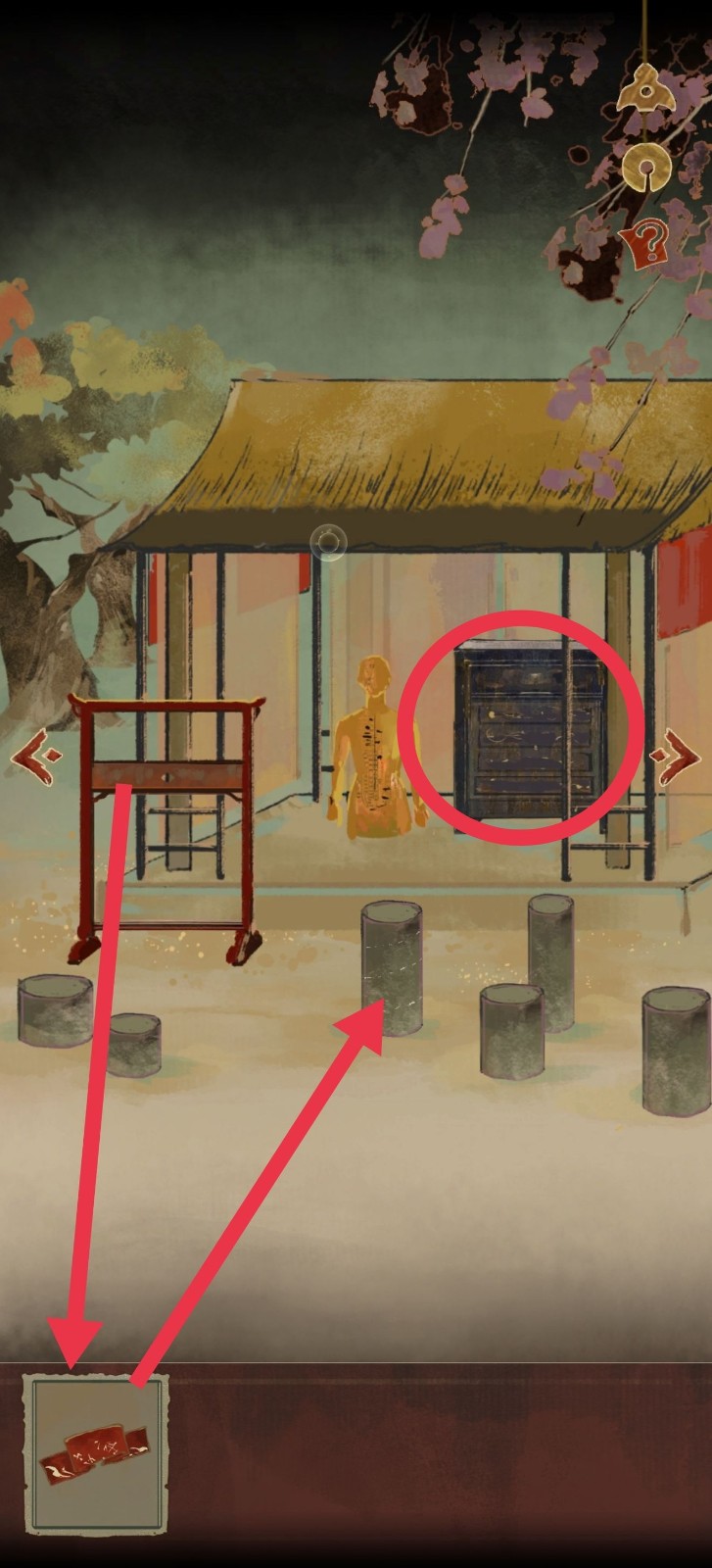 11、然后任劳任怨去找糖画(这里可以把左边的绸带拿了,看到柱子上有点白色痕迹,缠上去)糖画在右边圈起来的柜子里,这个谜题有点难搞,大概是个回文诗(?)反正跟着语感试出来的。