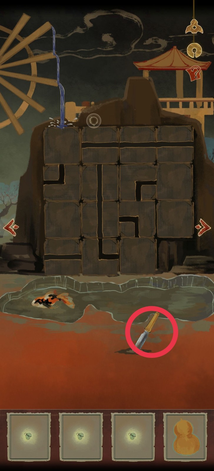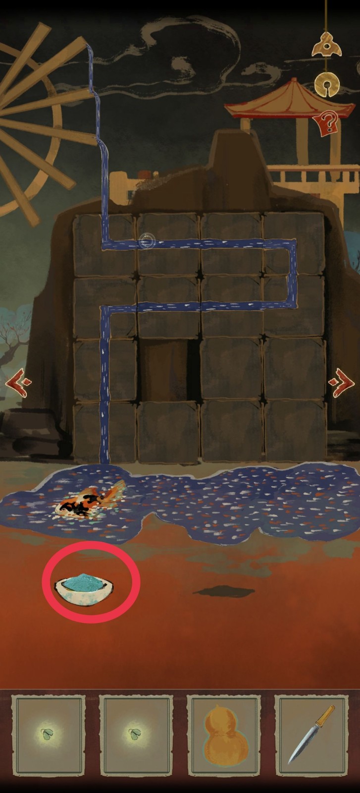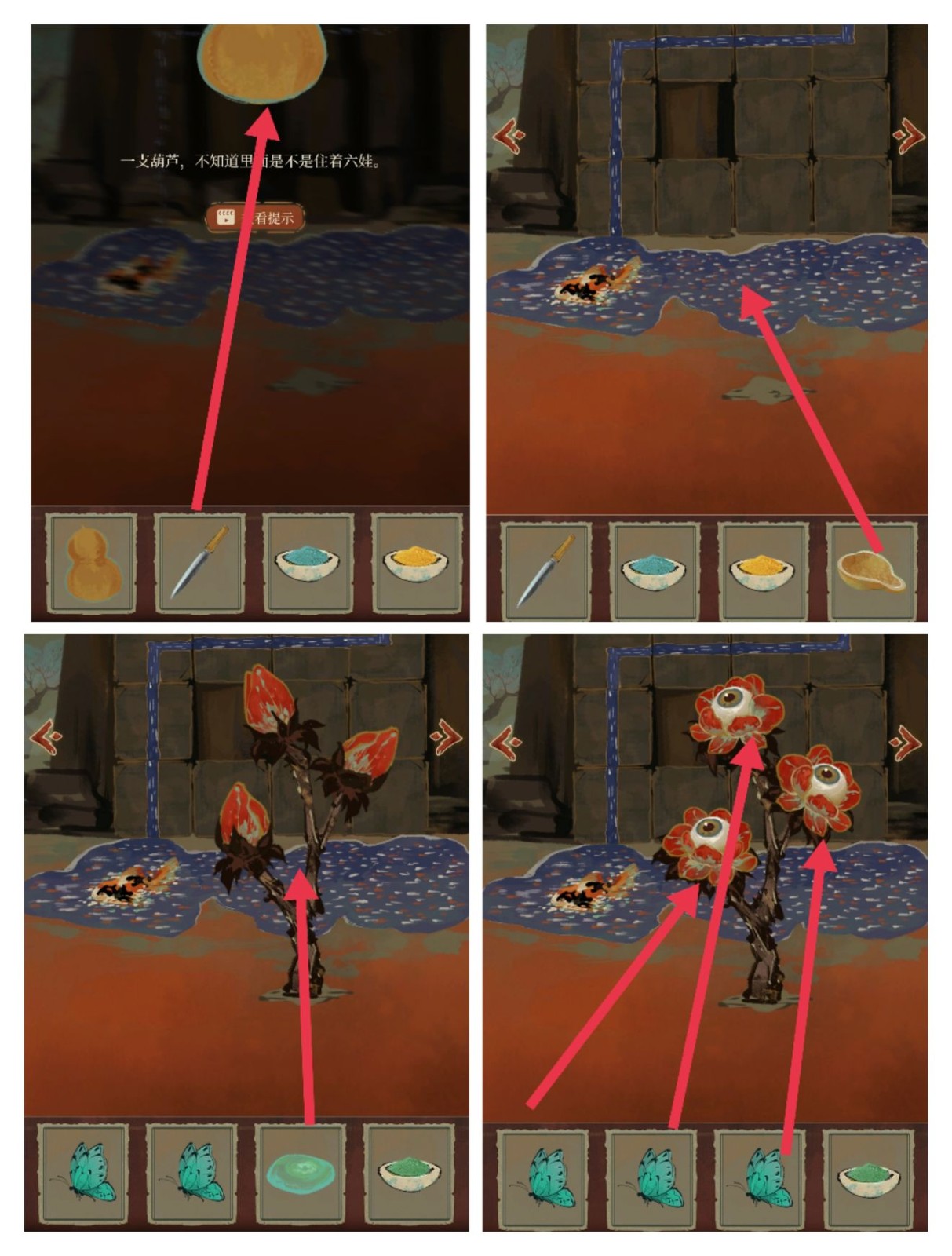 6、然后将种子种在拔出匕首的坑里,拿匕首把葫芦劈开,舀水,浇水,再用玉石催化一下,最后把蝴蝶放在花上传粉(?),就会飞出来一只鸟把鱼带走,最后留下一个盒子