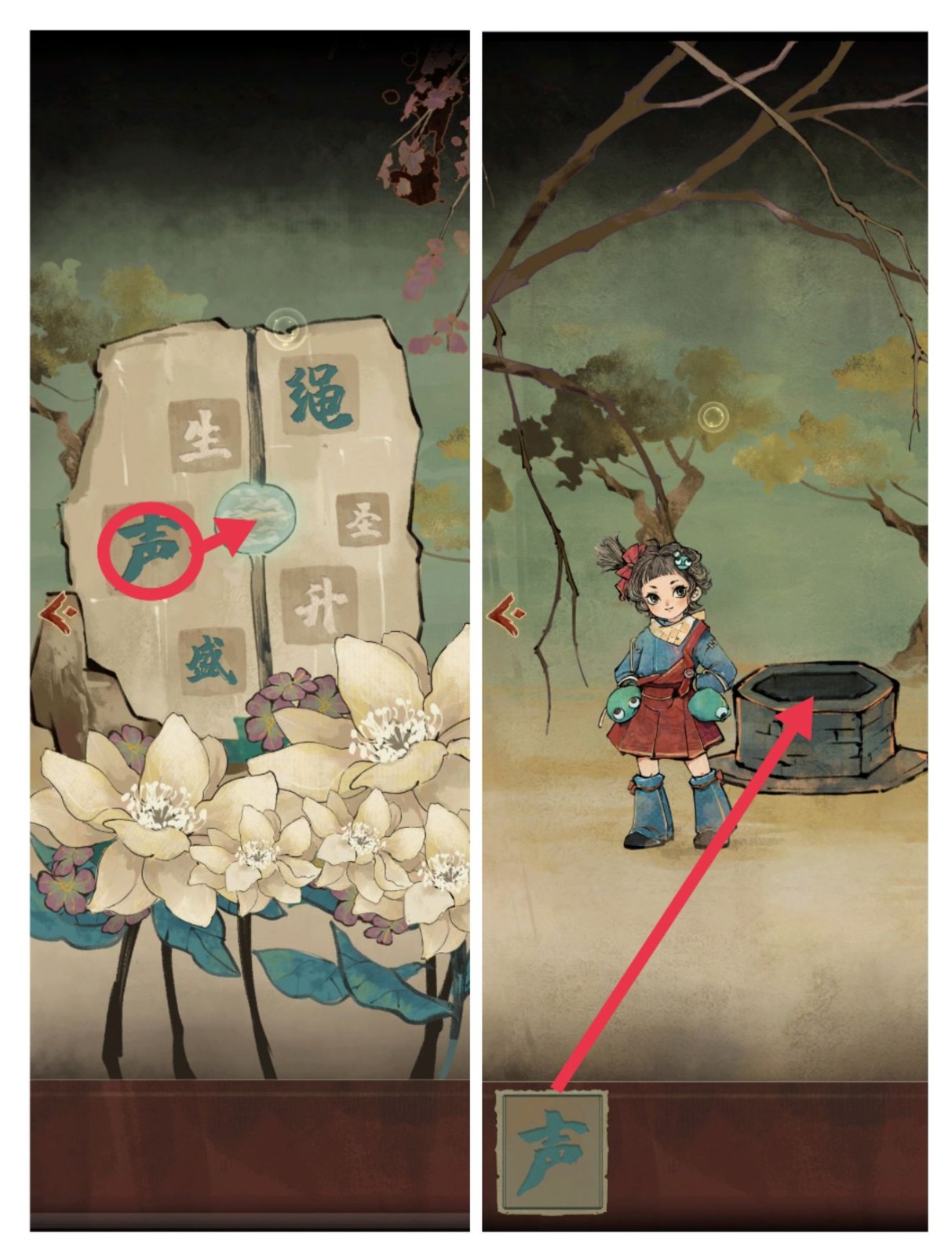 往右走把“声”拖进中间,“声”字就会出来,然后再把“声”字拖进神奇水井,就可以说话和听见了