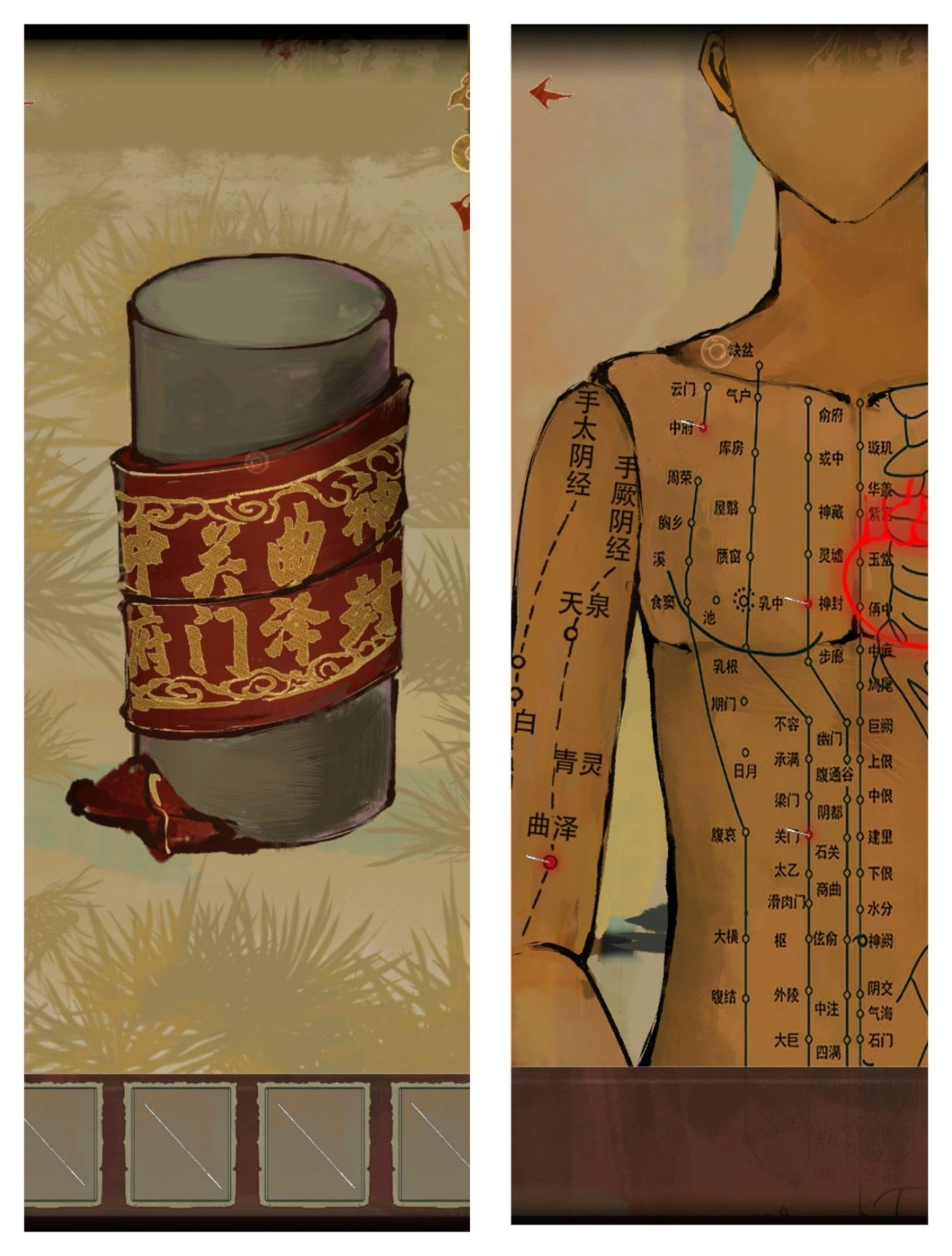 15、打开针灸盒,根据之前缠在柱子上的布条得到四个穴位,扎针,把木心交给女孩,听个故事,要木心开花,去字墙找“感”,扔井里,木心开花得到真心,发现是俩双胞胎女孩。