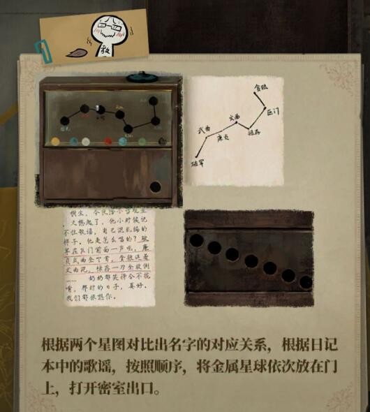 3、根据两个星图对比出名字的对应关系,根据日记本中的歌谣。