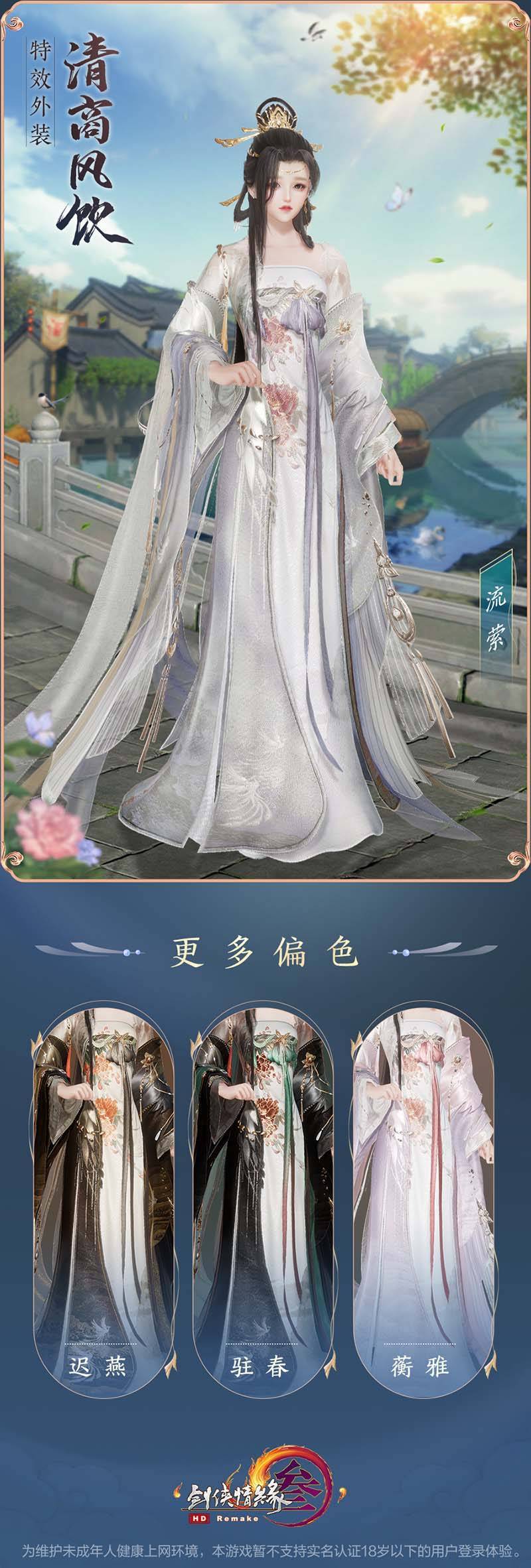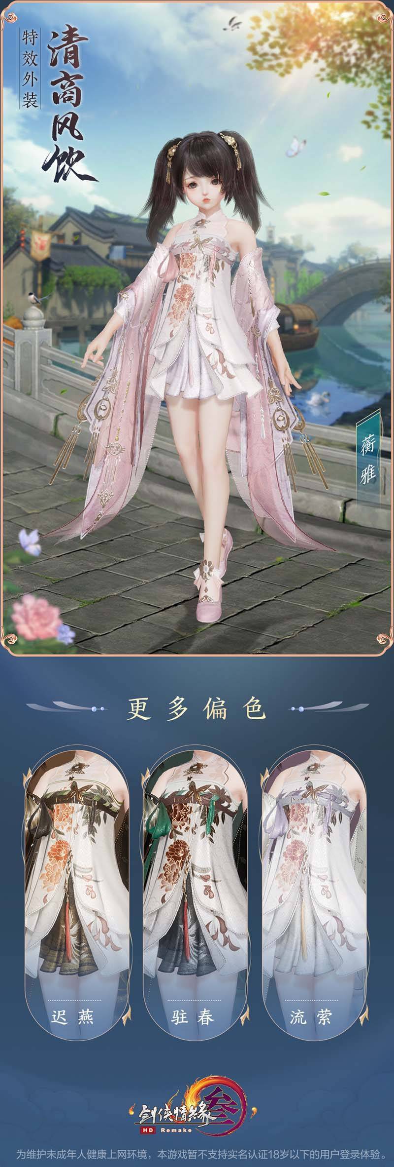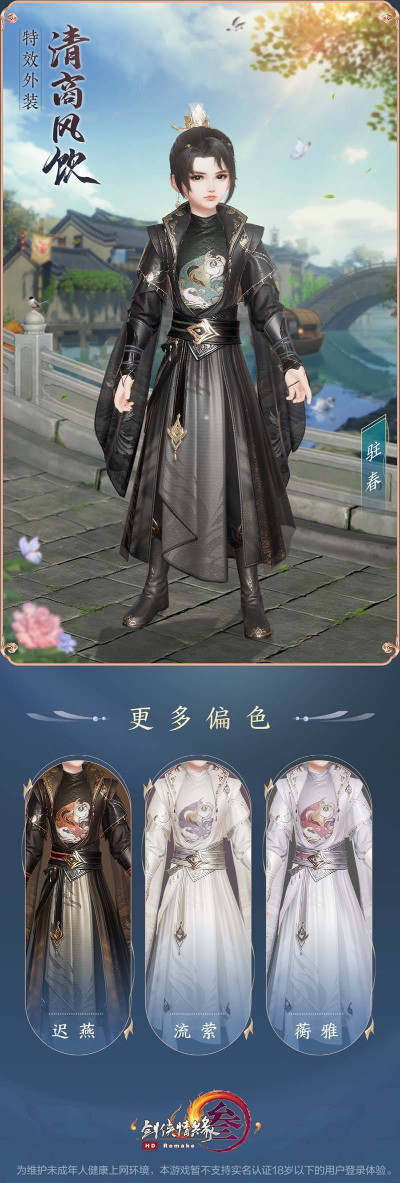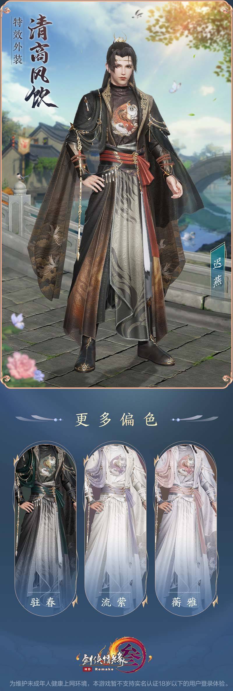 花下矜立,风流动人,全新特效外装“清商风饮”典雅登场!融入锦鲤与牡丹等元素,共有四款不同偏色,为侠士们带来更多选择!成男款潇洒自若仪态翩翩,高领设计更具高贵气度,袖袍襟摆云浪翻涌,飒洒飘逸。成女款落落大方身姿曼妙,裙摆搭配宽袖给人以温婉娴静之感,牡丹纹样点缀更凸显贵气端庄。萝莉款则采用可爱的短裙搭配飘逸袖摆,娇俏蝴蝶结和蝴蝶金饰点缀胸前,颇具灵动之感!正太款以干练底衫搭配利落腰封,将江湖意气与君子之雅巧妙融合,令人眼前一亮!侠士开启特效后,金光流转舞姿动人,举手投足之间牡丹盛放,书写一笔国色天香!