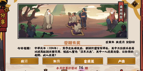 无悔华夏游戏中渔樵问答活动今天会为大家带来题目是:中平元年(184年),黄巾之乱爆发后,朝廷忙遭官军平乱,其中三位统兵名将对战局起到关键作用,被后人誉为“汉末三杰”,其中一人还是刘备、公孙瓒的老师,此人正是?接下来973游戏网小编为大家带来《无悔华夏》2022年10月17日渔樵问答答案分享,一起来看看吧。