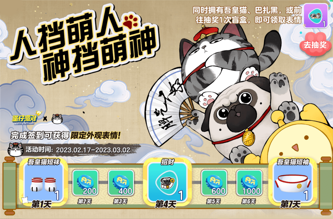 2月17日至3月2日期间,《蛋仔派对》×吾皇猫七日签到活动再次来袭!蛋仔们完成七日签到即可领取吾皇猫套装及丰厚瓶盖好礼,同时拥有两款联动外观或前往抽奖1次盲盒即可领取联动限定表情。