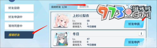 3、然后点击左侧的搜寻好友,在搜索栏中输入想添加好友的游戏id,找到后点击好友申请。等待对方同意申请即可。