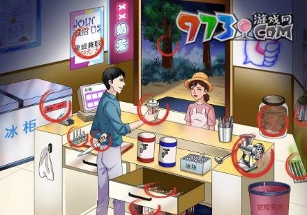 2、接着可以在画面上找到绞肉机、染血墩布、防腐液体、珍珠奶茶、人面树等细思极恐的答案。