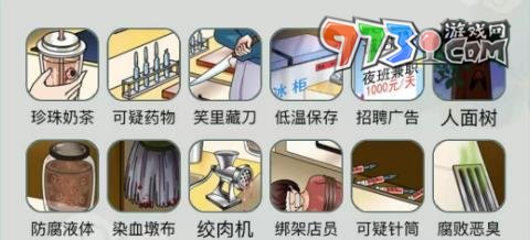 绞肉机、染血墩布、防腐液体、珍珠奶茶、人面树、招牌广告、低温保存、可疑药物、笑里藏刀、可疑针筒、腐败恶臭
