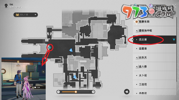 1、首先,如图所示传送到流云渡,红色标记处找到NPC茂贞。