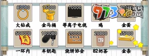 大钻戒、金马桶、等离子电视、鸡、金蛋、一环内、车钥匙、烧饼协会、82奶茶、金条