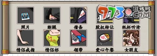 照片、断腿、借条、股权转让、纸杯听诊、情侣戒指、情侣衫、领带、爱心午餐、女朋友、灭火器