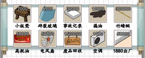 小板凳、碎裂玻璃、事故记录、漏油、竹蜻蜓、高耗油、电风扇、废品回收、空调、1880出厂