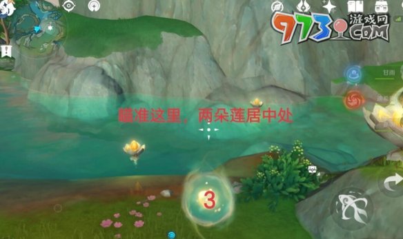 4、到达3后我们迅速瞄准后直接进入水中,要注意的瞄准两朵莲花的中间位置。