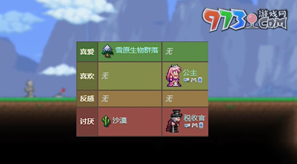 4、、虽然是一位限时NPC,但圣诞老人也有快乐值,其喜爱雪原生物群落,讨厌沙漠,喜欢公主,讨厌税收官。