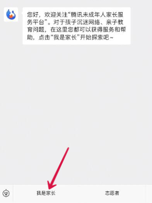 1、打开微信搜索腾讯未成年家长服务平台公众号,进入到公众号界面,点击左下角我是家长;