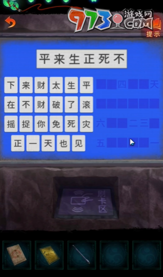 3、点击左侧的石碑,使用在阴阳牢箱子获取的钥匙卡开启电脑,根据黑无常头顶的线索可以得知密码就是【平来生正死不】。